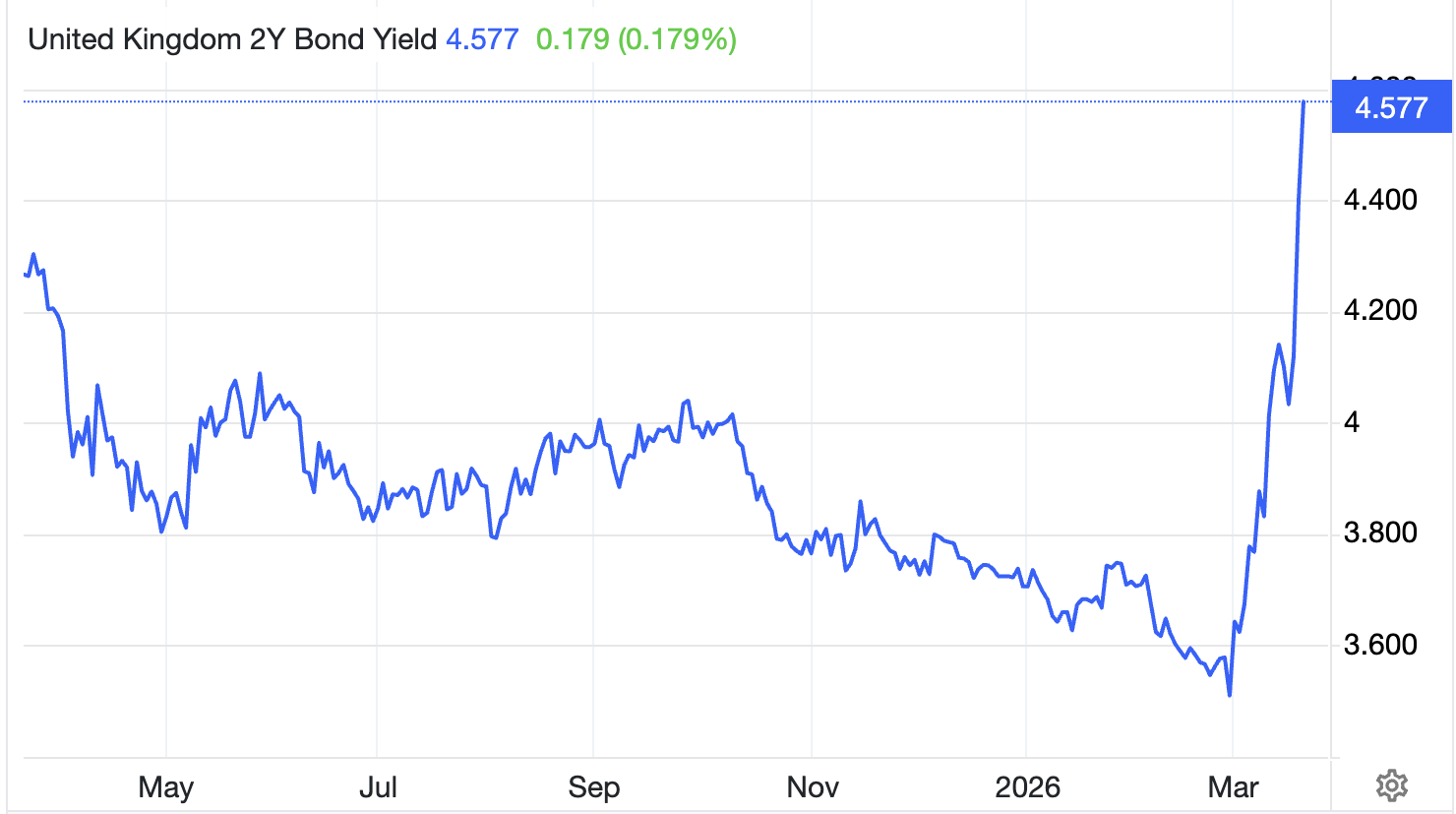 The 2-year Gilt yield has risen 107 basis points since 27 February. The 10-year Gilt breached 5% intraday — a level not seen since 2008. These are not incremental moves. They represent a violent reassessment of the interest rate environment over a matter of weeks. The bond market is not repricing risk. It is repricing reality.