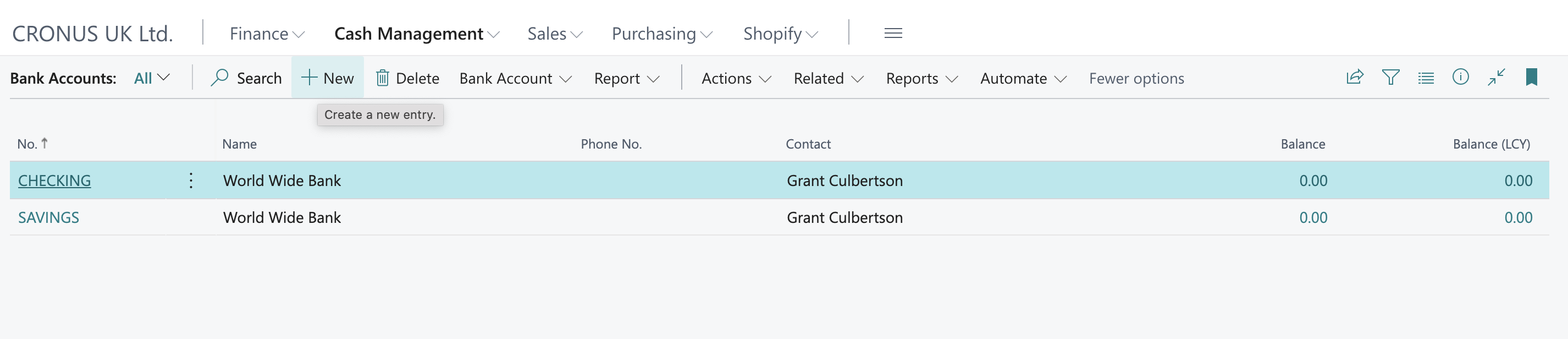 Go to the Cash Management section in Business Central and select Bank Accounts. Click on +New to start creating a new bank account :