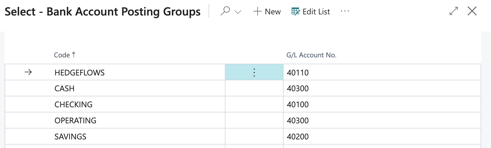 Create a new posting group - enter a Code to name the group such as "HedgeFlows", go to the G/L Account no. column, and Click on +New to add: