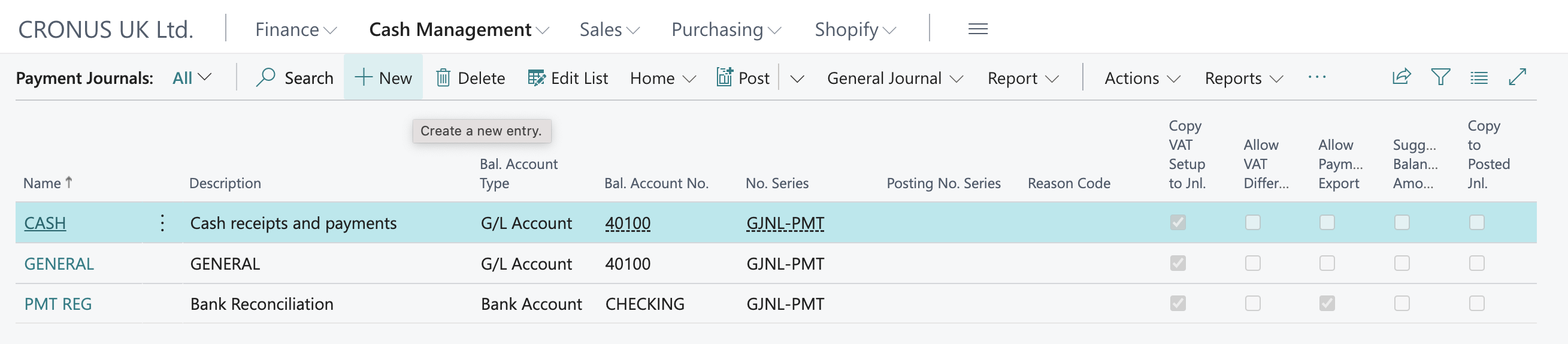 Go to the Cash Management section in Business Central and select Bank Accounts. Click on +New to start creating a new Payment Journal :