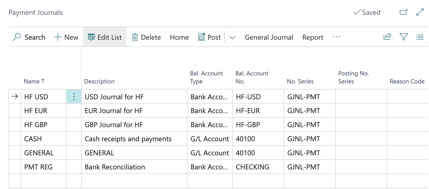 Enter the Name, Description for a Payment Journal in each currency and make sure to map it to Balancing Account Type "Bank Account" and Bal. Account No. that matches the accounts created in Step 3: